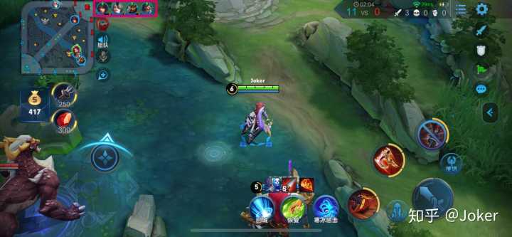 团战前先看看敌我双方状态对比,判断一下开团位置是否有利,扫一眼队友大招好了没(我希望每位玩家都知道怎样看队友大招),如下图左上角粉红框内所示:绿色小三角是实心的表示该队友有大招,空心的则表示队友大招处于CD状态。
